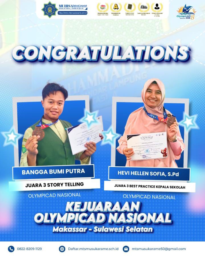 Dalam kompetisi tingkat nasional tersebut, siswa MUHISA, Bangga Bumi Putra, berhasil meraih Juara 3 Story Telling. Prestasi ini menjadi kebanggaan tersendiri bagi madrasah, mengingat persaingan yang ketat dari berbagai peserta terbaik dari seluruh Indonesia.